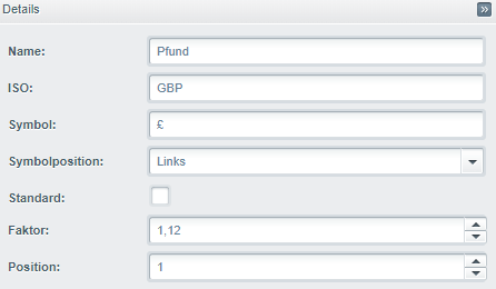 Um eine neue Währung anzulegen wählen wir “Währungen” in den Shopeinstellungen und klicken auf “Hinzufügen”. Die auszufüllenden Felder sind sehr überschaubar – gehen wir dies mal am Beispiel von britischen Pfund durch: