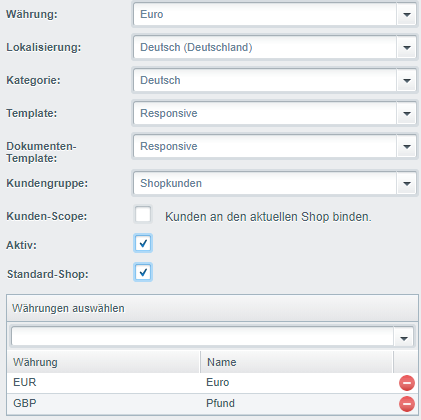 Um die Währung jetzt in den Shop einzubinden wählen wir, ebenfalls in den Grundeinstellungen, den Punkt “Shops” aus und klicken unseren Shop an. Auf der rechten Seite können wir entweder die Standard-Währung verändern oder weiter unten eine weitere Währung hinzufügen.